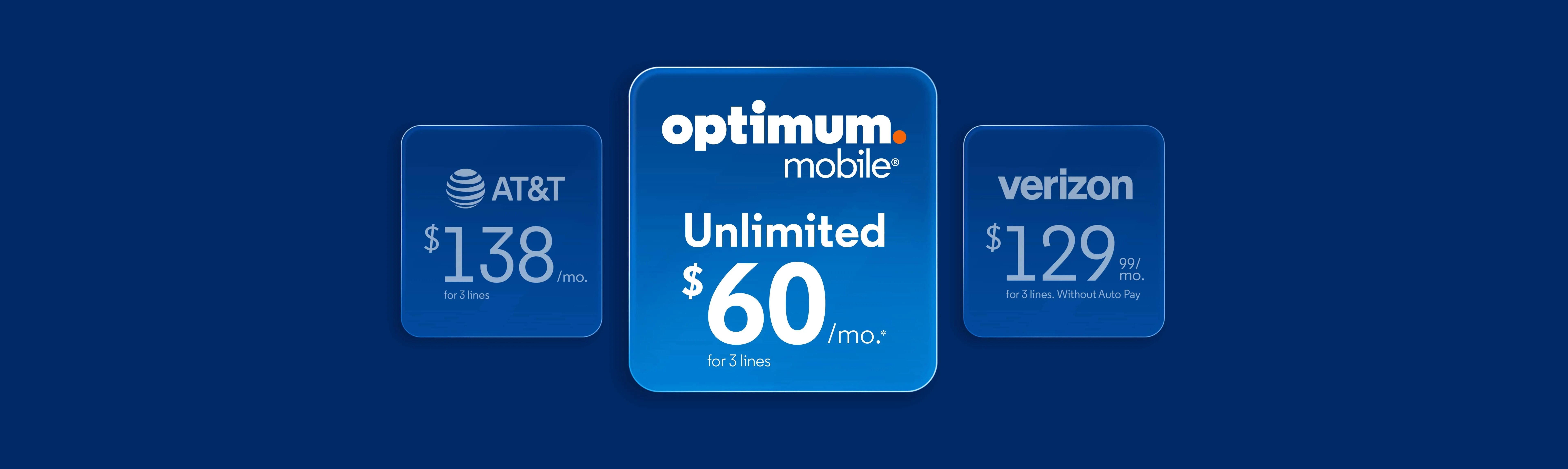 +Savings claim against Verizon based on comparison of 3 lines of service with Optimum Mobile Unlimited plan vs Verizon Unlimited Welcome plan, without Auto Pay, as of 12/11/25. Savings claim against AT&T based on comparison of 3 lines of service with Optimum Mobile Unlimited plan vs AT&T Unlimited Starter plan, with Auto Pay, as of 12/11/25.