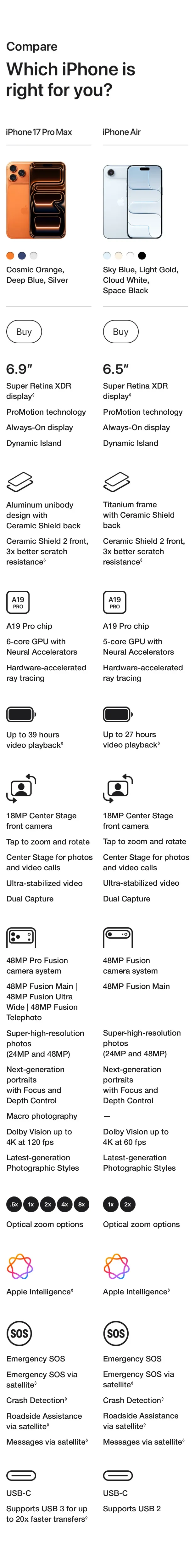 iPhone 17 Pro Max. The most powerful iPhone ever. Brilliant 6.9-inch display,1 aluminum unibody design, A19 Pro chip, all 48MP rear cameras, and best-ever battery life.
