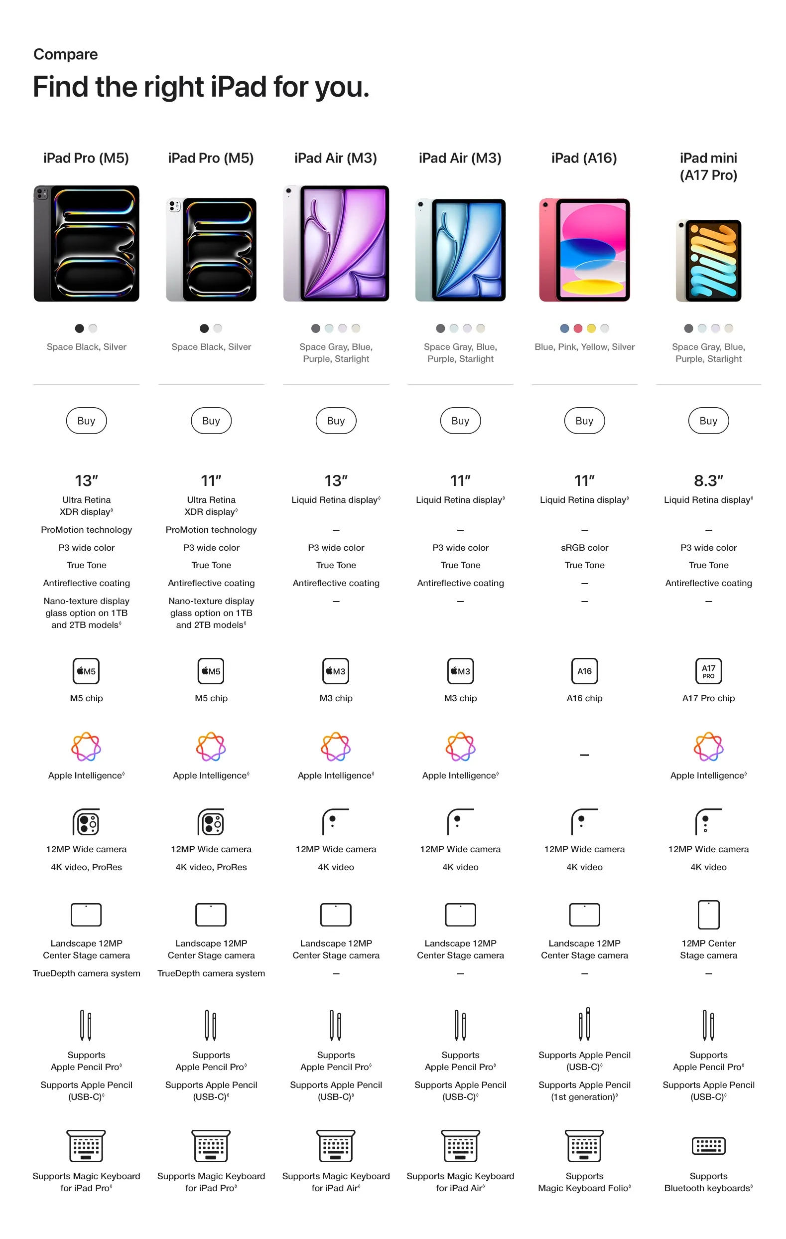 iPad Pro. Built for Apple Intelligence.1 iPad Pro, powered by the Apple M5 chip, delivers outrageous performance for effortless productivity and advanced AI workflows. With a stunning Ultra Retina XDR display, superfast Wi-Fi 72 and 5G Cellular3, Neural Accelerators for AI workloads, and a redesigned iPadOS, there’s no limit to what you can do with iPad Pro. Paired with Apple Pencil Pro and Magic Keyboard for iPad Pro, it brings endless versatility, creativity, and productivity to your fingertips.